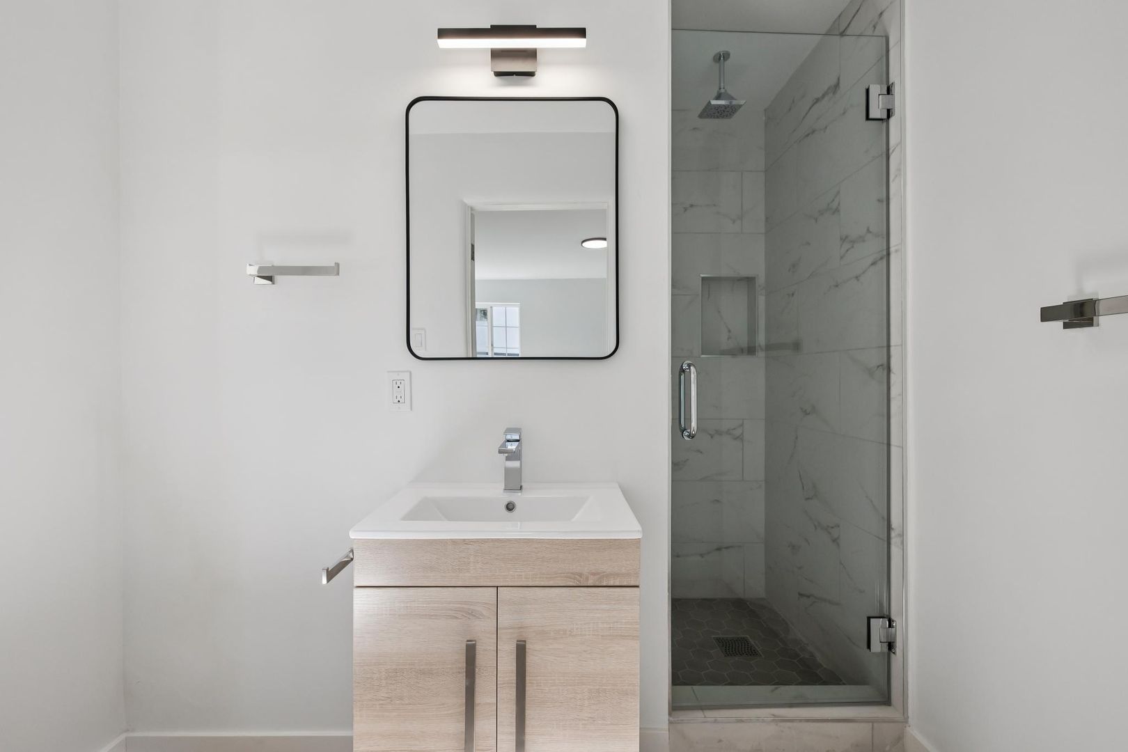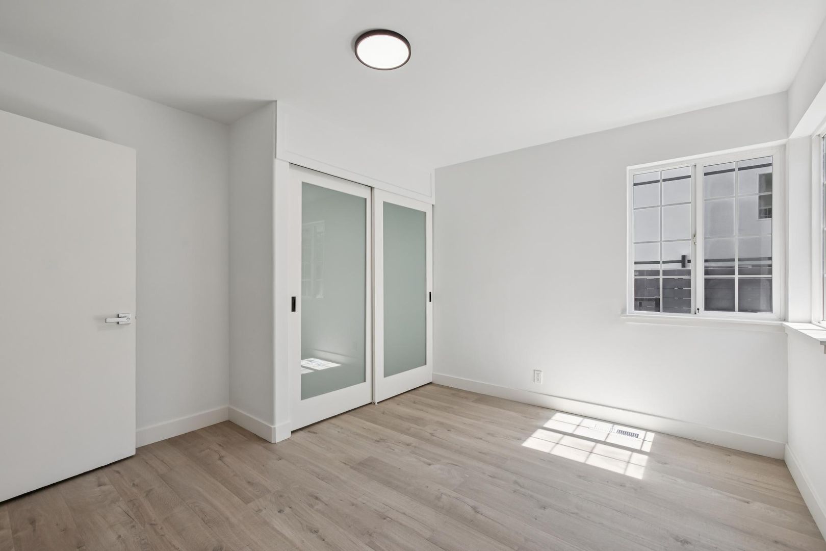 The interior offers an open, light-filled plan anchored by wide-plank hard flooring throughout the main living areas. The chef-forward kitchen features white quartz countertops, shaker-style cabinetry with matte-black hardware, a deep undermount sink with a contemporary pull-down faucet, and stainless-steel appliances including a professional-style gas range and over-the-range microwave. Flush mount LED lighting washes the rooms in illumination. Both bathrooms are beautifully tiled with quality fixtures and thoughtful finishes. Large windows and French-style doors bring abundant natural light and connect the living spaces to a private outdoor patio that is ideal for al fresco dining and quiet relaxation. Practical conveniences include in-unit washer/dryer, whole-unit air conditioning for consistent comfort, and rear on-site parking.