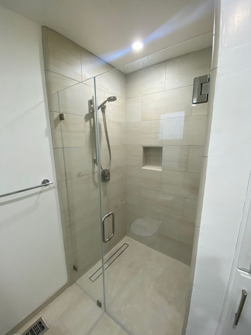 Both bathrooms have been recently renovated with clean, contemporary finishes, including a primary bath featuring a walk-in glass-enclosed shower with large-format tile and a built-in niche.